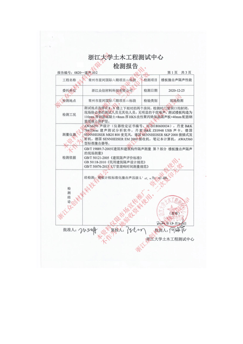 8mm改性聚丙烯保溫隔聲板樓板撞擊聲隔聲性能檢測報告